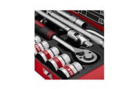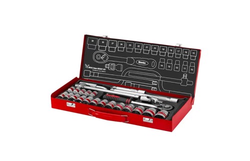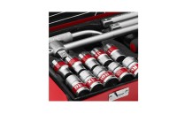 Incluye dados, manilla de carraca, manilla de velocidad, T deslizante, unión universal y barras de extensión.